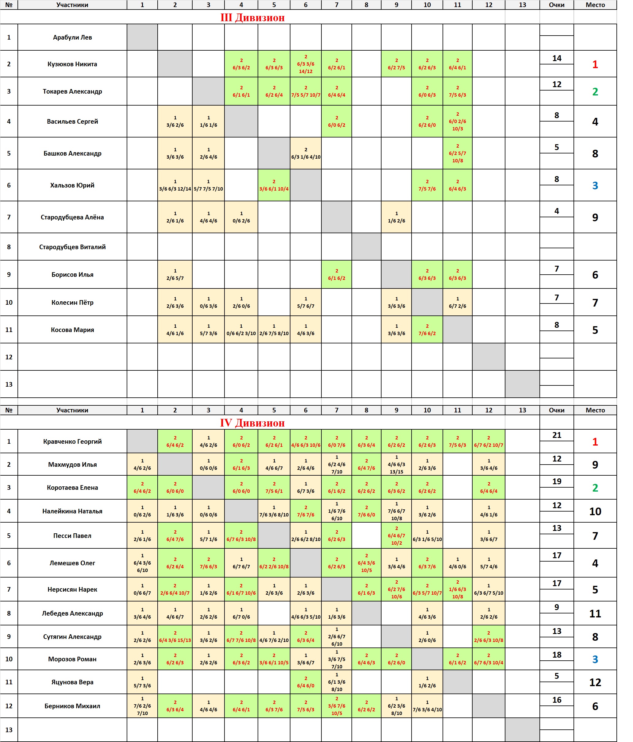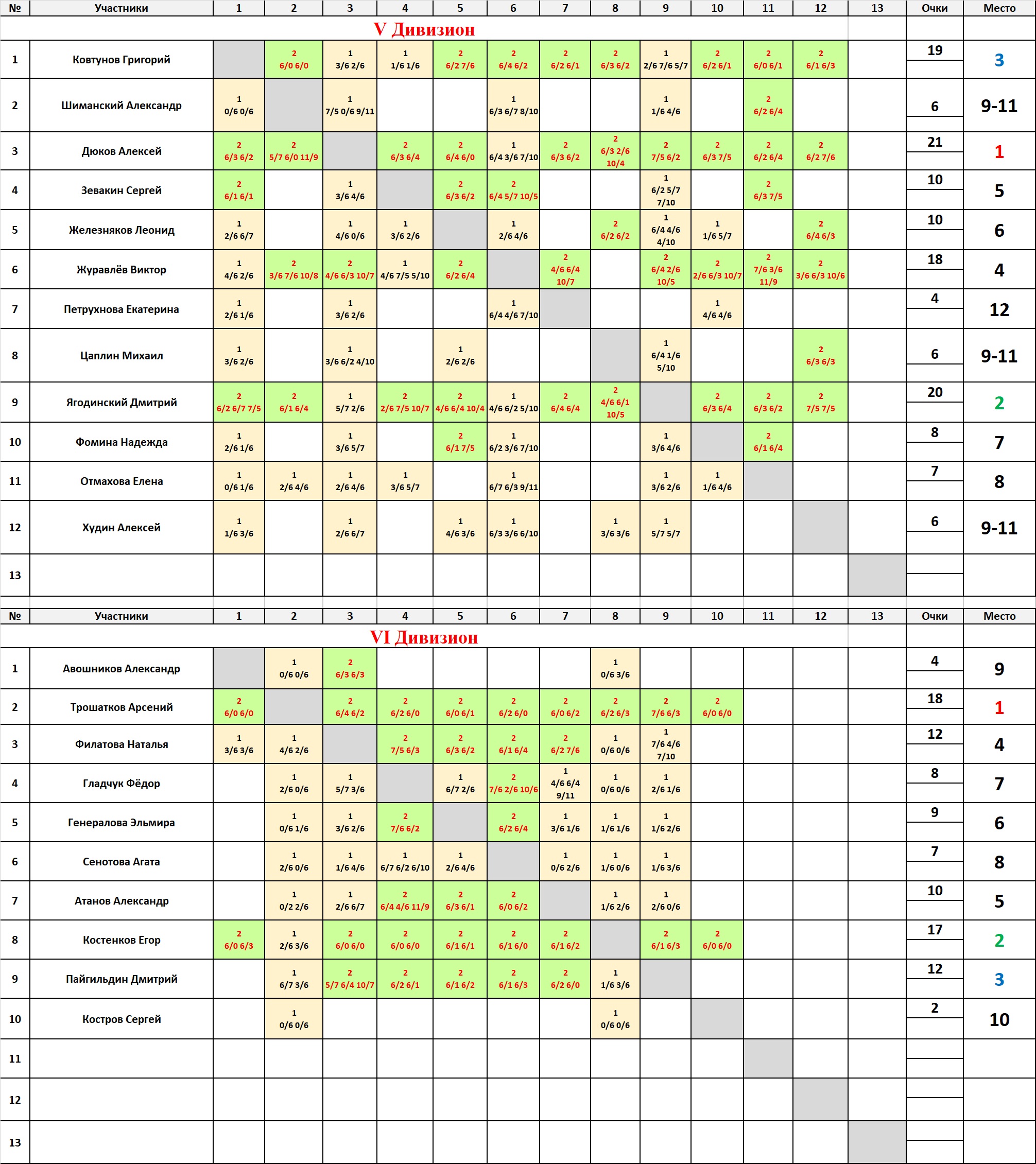 - по результатам турнира игроки, занявшие с 1 и 3 места во II, III , IV , V , VI дивизионах переходят в дивизион выше, соответственно игроки ,занявшие последние три места в I,II,III, IV, V дивизионах , переходят в дивизион ниже.