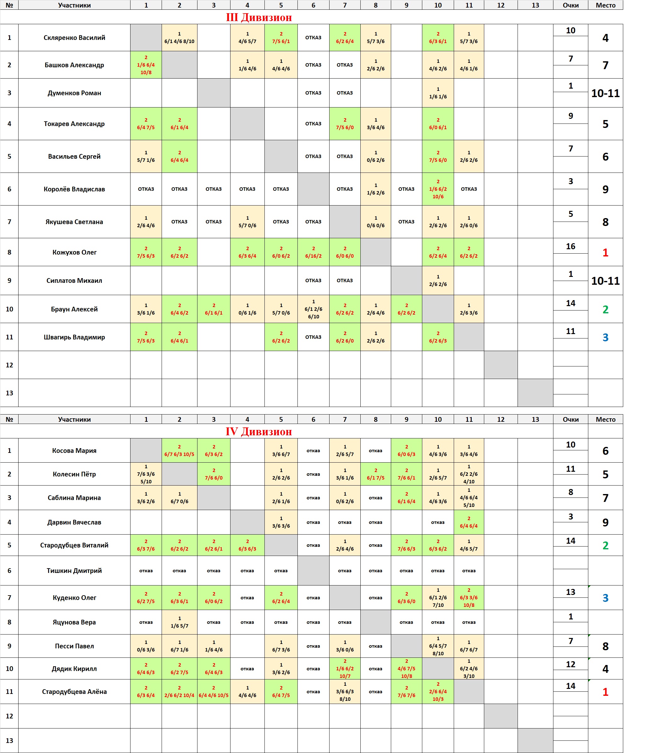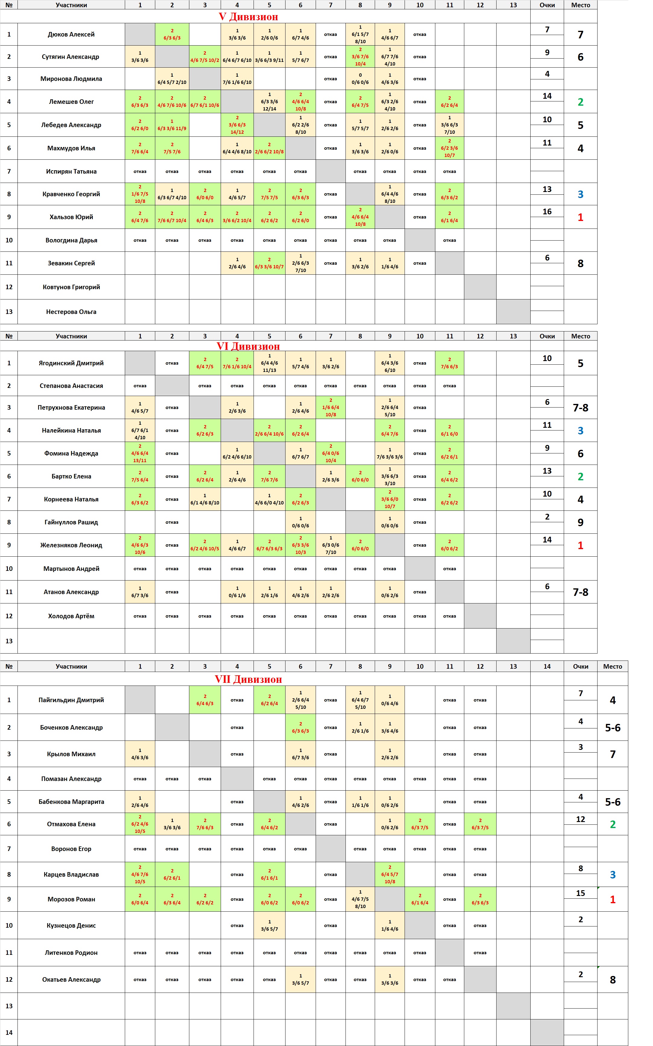 - по результатам турнира игроки, занявшие с 1 и 3 места во II, III , IV , V , VI и VII дивизионах переходят в дивизион выше, соответственно игроки ,занявшие последние три места в I,II,III, IV, V и VI дивизионах , переходят в дивизион ниже.