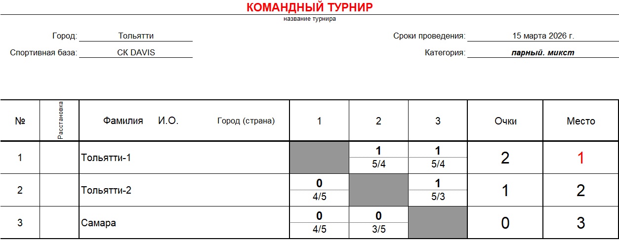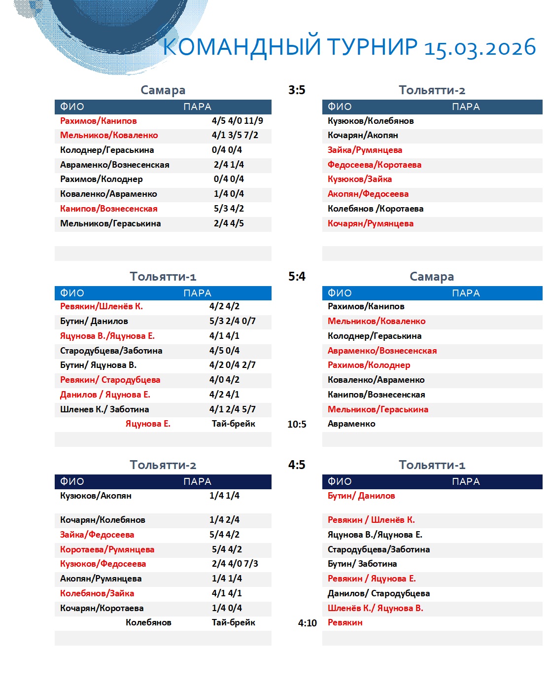 | Команда Тольятти-1 Академия тенниса | Команда Тольятти-2 | Команда Самары |