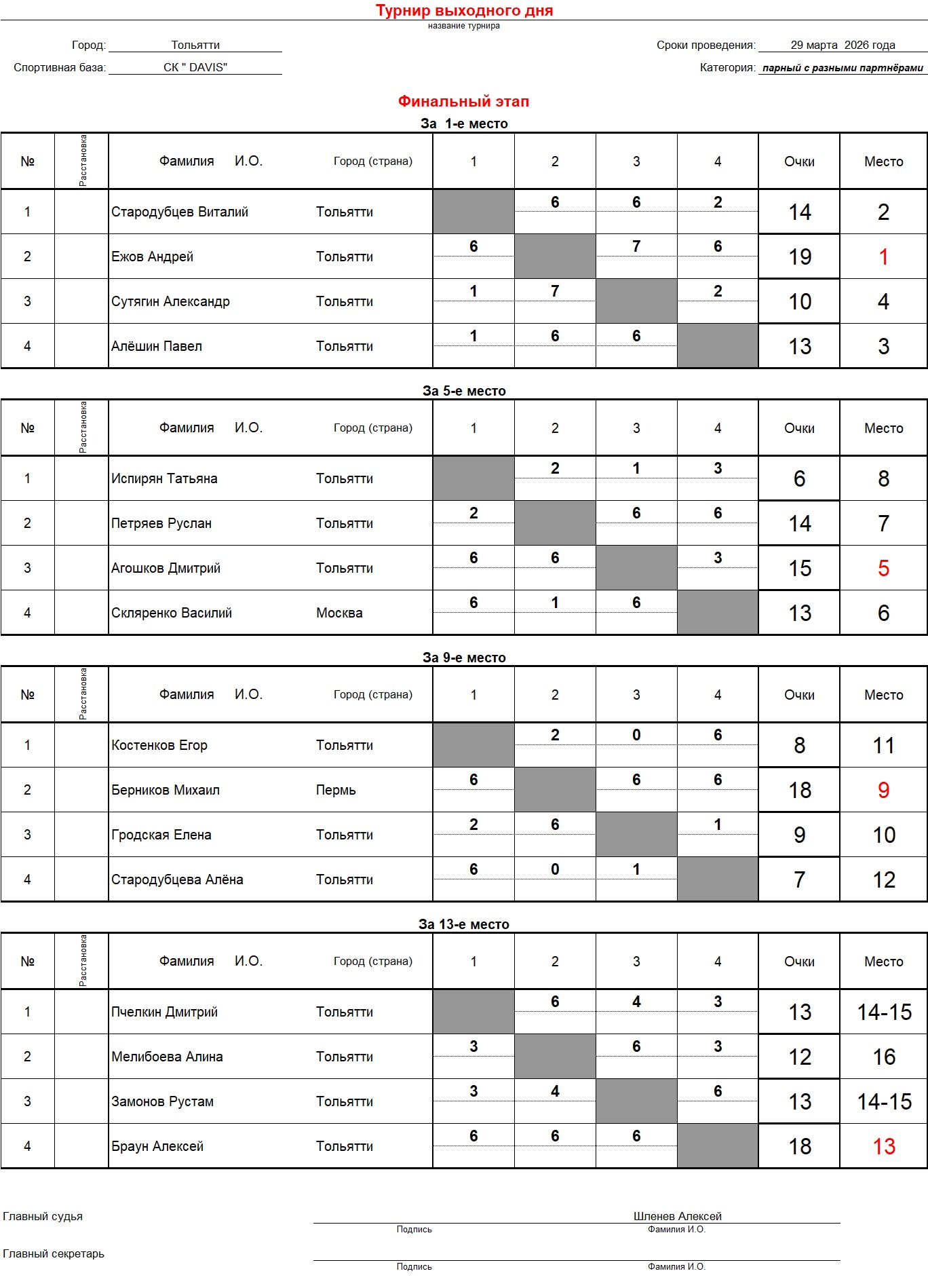 - игры турнира проходят из 1 сета до 6 геймов с розыгрышем решающего очка при счете ровно, при счете 6:6 играется тай-брейк до 7 очков
