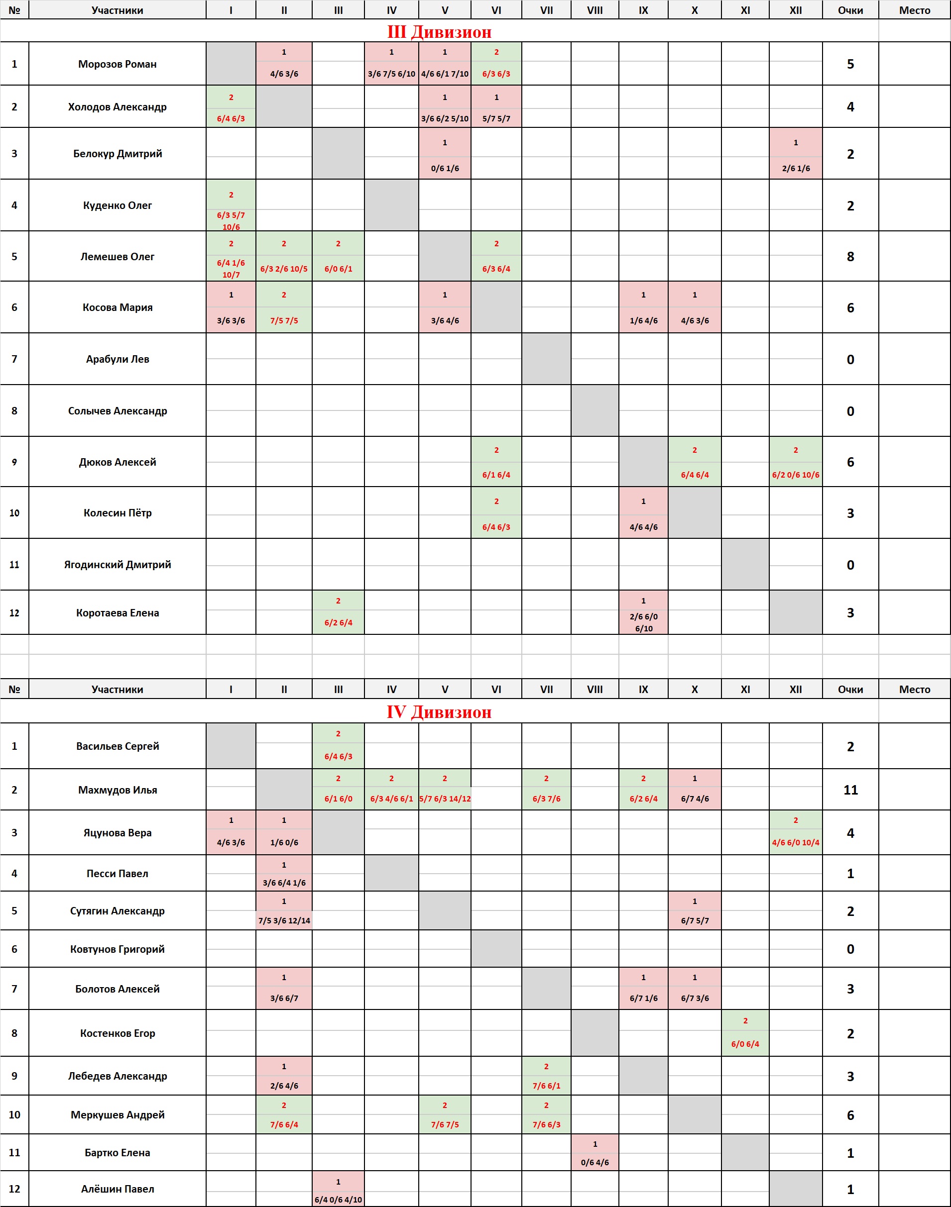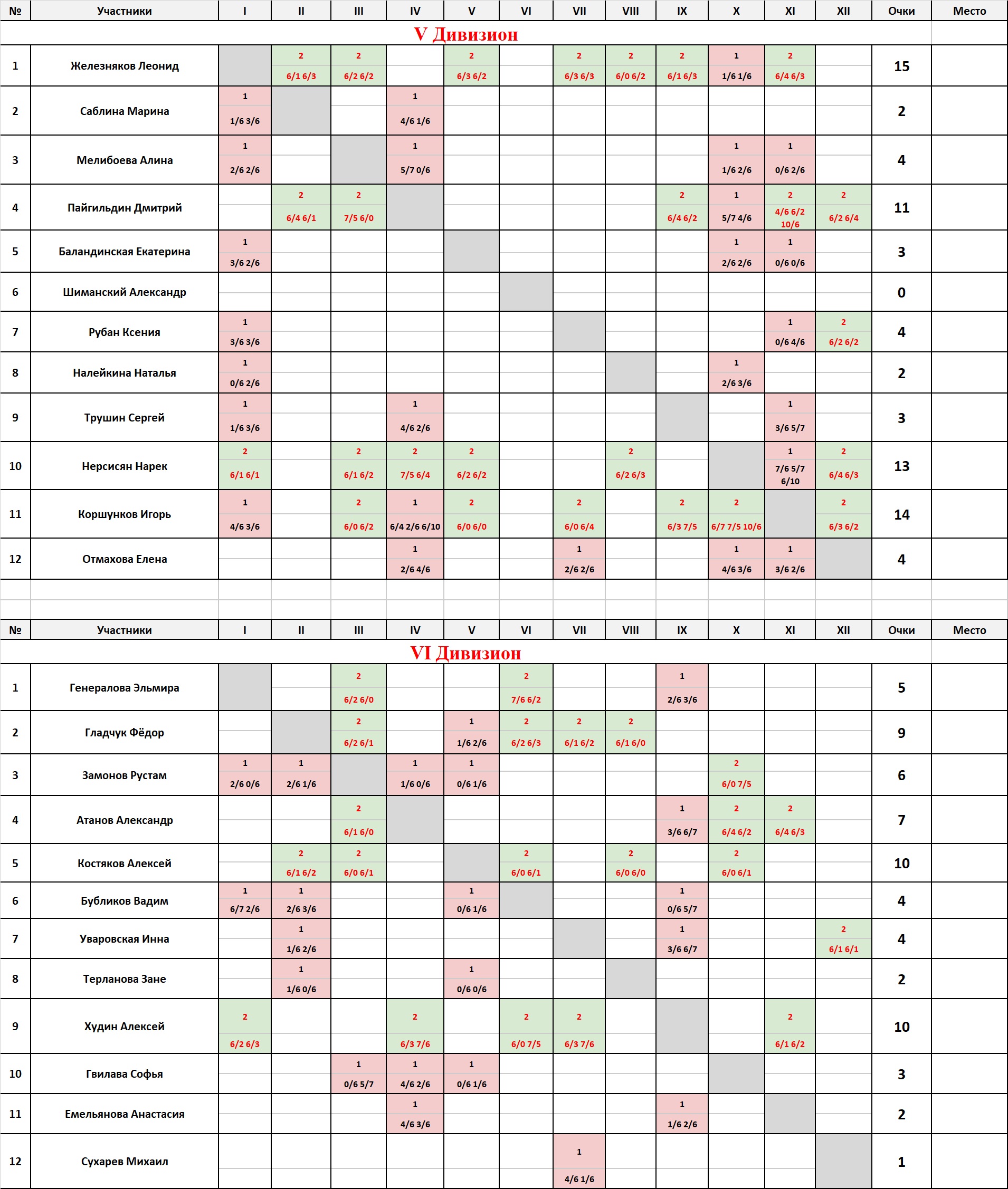 - по результатам турнира игроки, занявшие с 1 и 3 места во II, III , IV , V , VI дивизионах переходят в дивизион выше, соответственно игроки ,занявшие последние три места в I,II,III, IV, V дивизионах , переходят в дивизион ниже.