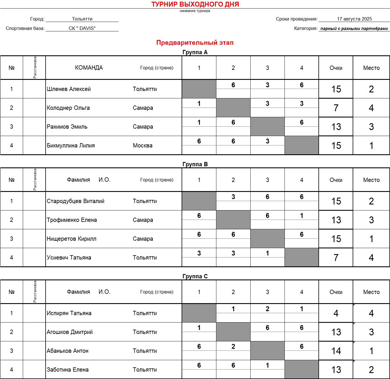 - игры турнира проходят из 1 сета до 6 геймов с розыгрышем решающего очка при счете ровно, при счете 6:6 играется тай-брейк до 7 очков