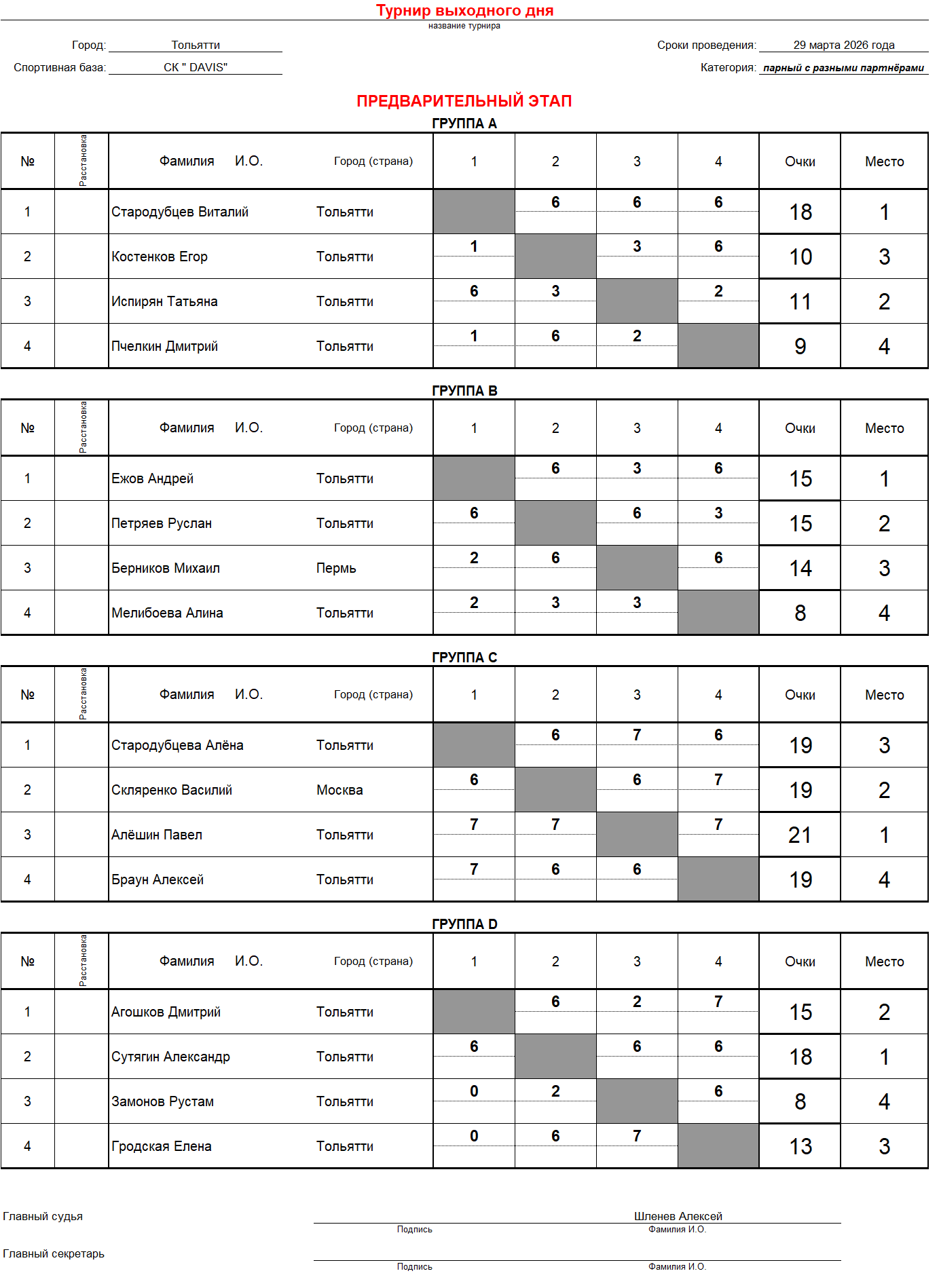 - игры турнира проходят из 1 сета до 6 геймов с розыгрышем решающего очка при счете ровно, при счете 6:6 играется тай-брейк до 7 очков